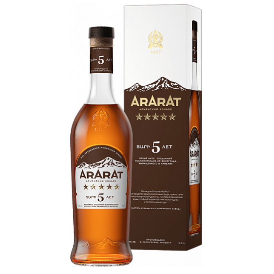 Коньяк Арарат, 5 летней выдержки 0.5 л 5 звезд в подарочной коробкеКоньяк Арарат, 5 летней выдержки 0.5 л 5 звезд в подарочной коробке