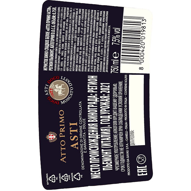 Легкое белое игристое вино из винограда сорта Москато Бьянко. Цвет соломенный с золотистыми бликами. Изящный букет с нотками экзотических фруктов, шалфея и медовыми нотами. Вкус яркий, сбалансированный, с тонами экзотических фруктов и освежающим послевкусием. Превосходный аперитив, прекрасно гармонирует с выпечкой, десертами и фруктовыми салатами. Atto Primo Asti имеет классификацию D.O.C.G., что гарантирует его подлинность и высокое качество. Рекомендуемая температура подачи: +8-10 °C.