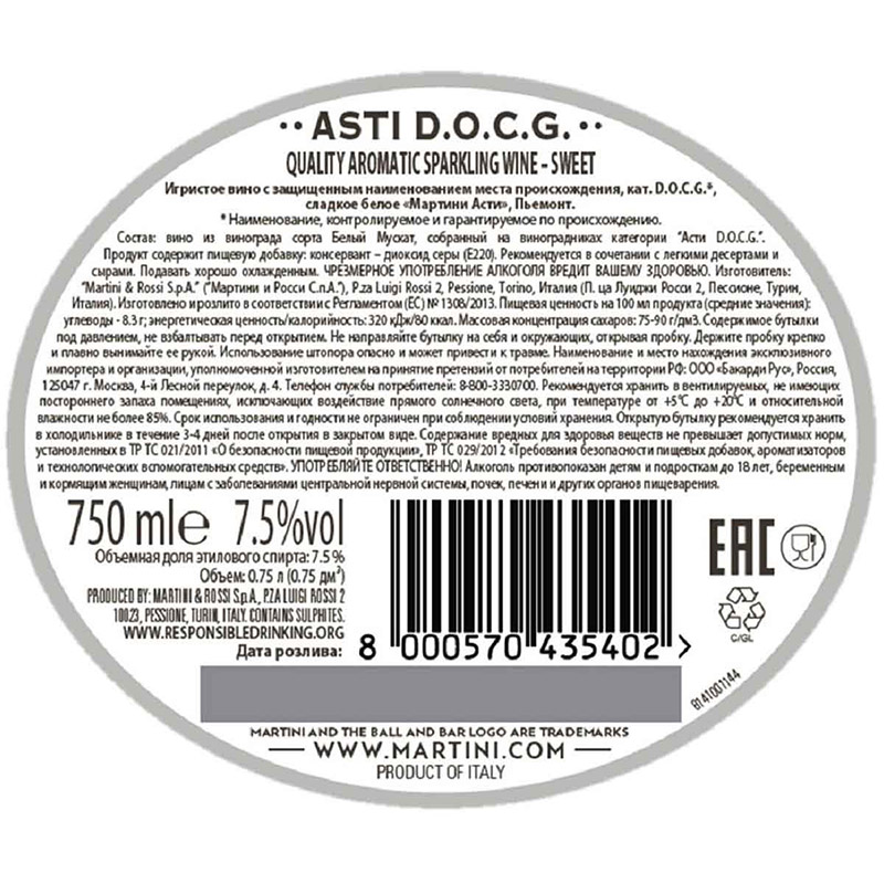 Вино игристое Мартини Асти DOCG Пьемонт белое сладкое 0.752 100 ₽