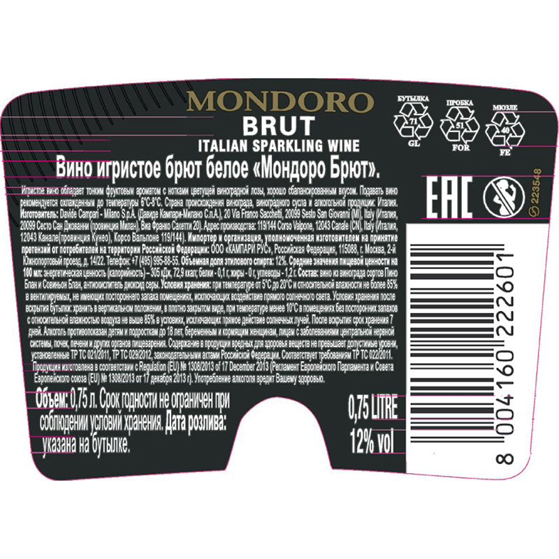 Mondoro Brut производится из винограда, выращенного в итальянском Пьемонте (Piemonte). Благодаря неполной ферментации, вино получается очень нежным, ароматным и элегантным. В бокале напиток играет нежно-соломенными бликами. Вкус свежий, тонкий с изящными медовыми тонами. В аромате чувствуются нотки мускатного винограда и нюансы цветущей лозы. Идеальный аперитив в начале любого вечера. Также превосходно сочетается с морепродуктами. Рекомендуемая температура подачи: +6-8 °С.