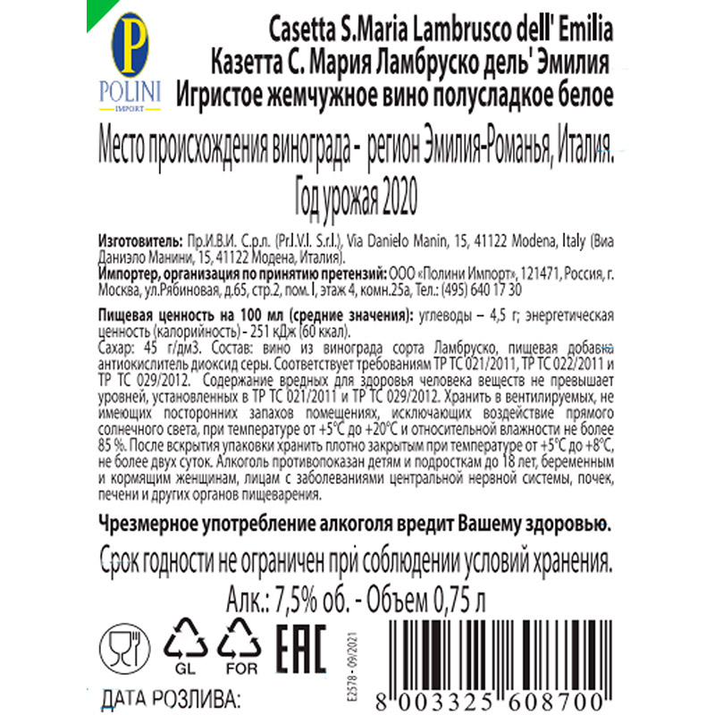 Вино игристое жемчужное Казетта С.Мария Ламбруско дель Эмилия белое полусладкое 0,75 л