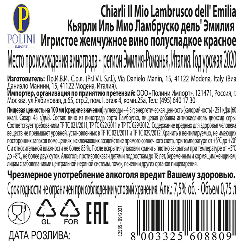 Вино игристое жемчужное Кьярли Иль Мио Ламбруско дель Эмилия красное полусладкое 0,75 л