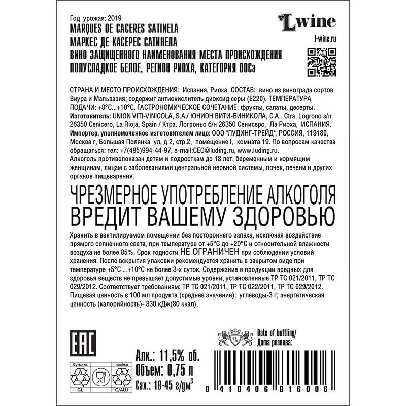 Вино Маркес Де Касерес Сантинела Риоха DOC белое полусладкое 0,75 л