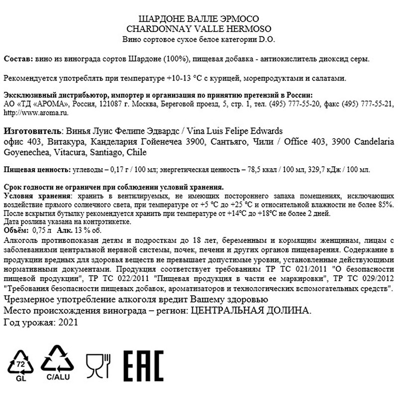 Vina Luis Felipe Edwards — семейная компания, ведущий производитель вина в Чили. Виноградники винодельни расположены в самом сердце этой прекрасной страны. При создании линейки Valle Hermoso семья вдохновлялась видом с вершин гор долины Пукилье-Альто. Chardonnay Valle Hermoso имеет нежный светло-желтый цвет с золотыми бликами. В аромате присутствуют ноты белых фруктов, ананаса и миндаля, а во вкусе тропические и цитрусовые ноты. Вино обладает приятной кислотностью, средним телом. Отлично сочетается с морепродуктами, птицей и твердыми сырами. Рекомендуемая температура подачи — 12°С.