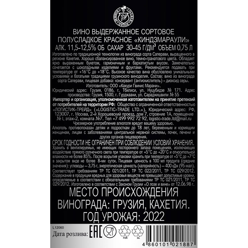 Вино выдержанное сортовое Кахури Киндзмараули красное полусладкое 0,75 л